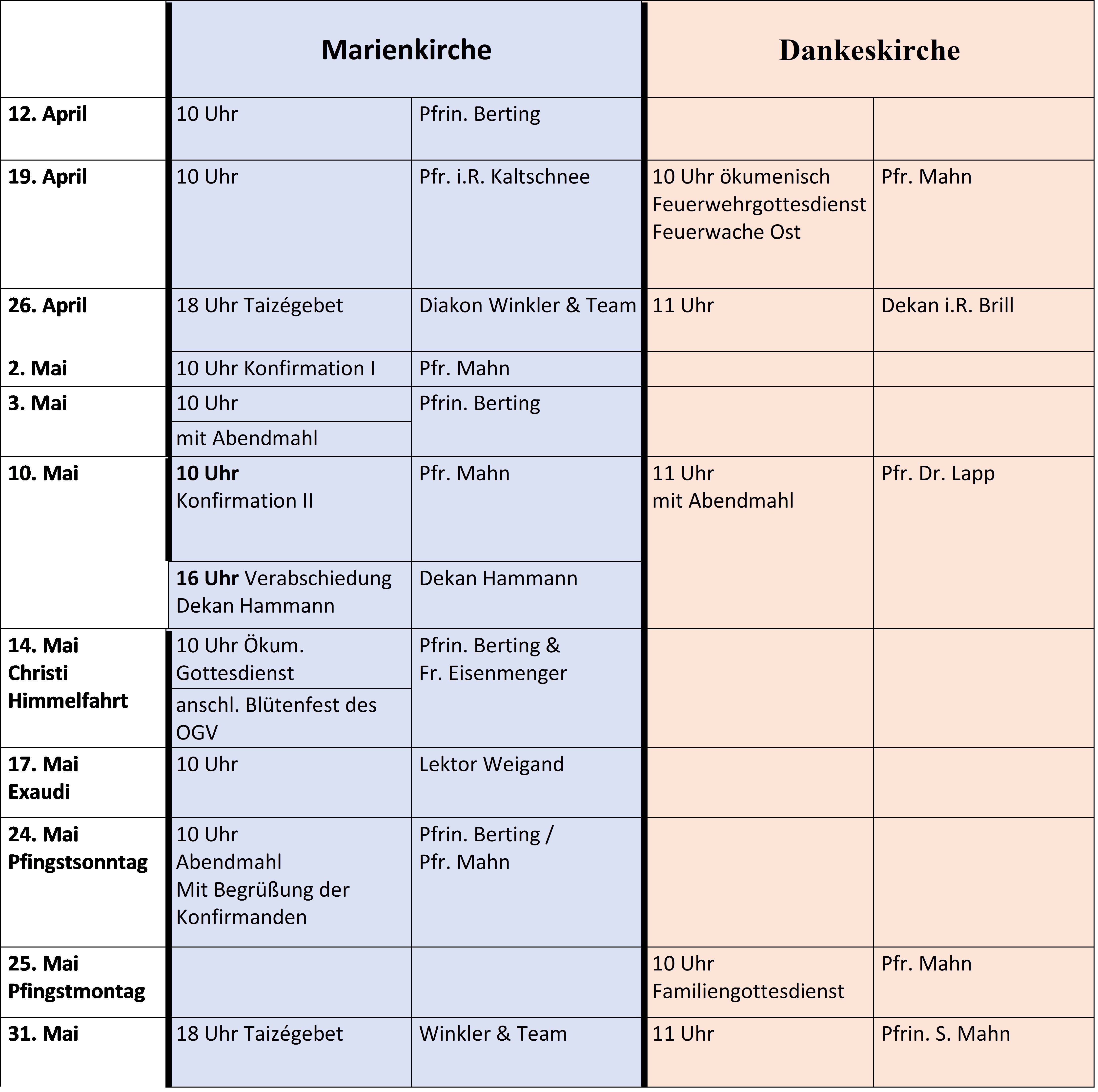 Die nächsten Gottesdienste in der Marienkirche und Dankeskirche: